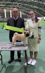 Rayne is our Covid baby, by the time lockdown restrictions lifted she was already 7 1/2 months old. We didn't know how she would handle the show environment with all the noise and other dogs since she missed so much vital exposure during lockdowns. However she soon proved to us she was here with a purpose taking out Runner Up in Show on her very first outing. This little girl is simply stunning, she loves Paige and they have a great time together. These two make a beautiful team and if they continue as well as they started out then this will be a very promising team indeed. 2020 and 2021 has been heavily restricted and there hasn't been much opportunity with our shows, we can only hope Rayne enjoys the show environment as much as she did when first started. She really is such a beautful little Pug with such a cheeky personality.