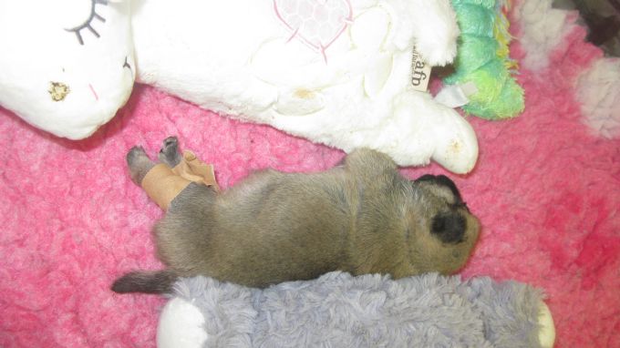 This puppy had it's rear legs taped together to stop it from rolling on it's belly which can cause them to go flat chested. This usually corrects itself once they are up on their feet, some just need a little extra help getting there. The toy lamb in the photo offers extra comfort with the sounds of a heart beat so the puppy won't feel all alone.